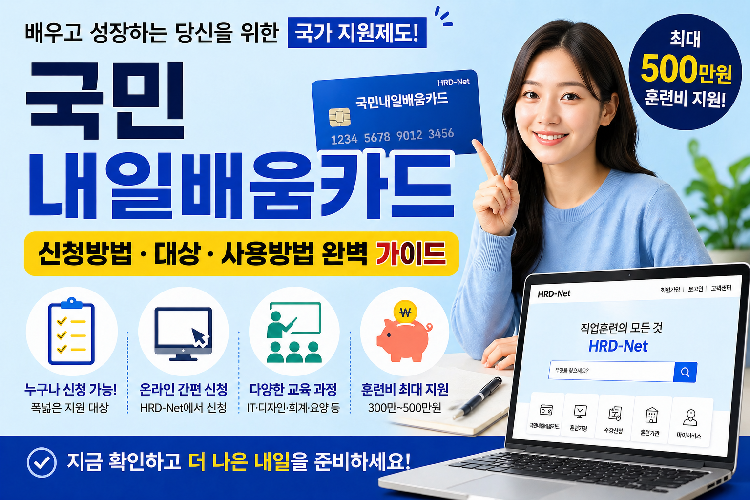 배우고 싶은 마음은 있는데 교육비가 부담돼 망설였던 적 있으신가요? 취업 준비, 이직, 재취업, 경력 전환, 혹은 새로운 부업을 위한 실무 교육까지 요즘은 ‘배움’ 자체가 경쟁력이 되는 시대입니다. 하지만 현실은 학원비와 강의비가 만만치 않죠. 그래서 많은 사람들이 찾는 제도가 바로 국민내일배움카드입니다. 국민내일배움카드는 일정 조건에 해당하면 직업능력개발 훈련비를 국가가 지원해 주는 제도로, 취업준비생부터 직장인, 자영업자, 경력단절여성까지 폭넓게 활용할 수 있습니다. 문제는 “나는 대상이 될까?”, “어디서 신청하지?”, “어떤 강의를 들을 수 있지?”처럼 막상 알아보려면 정보가 흩어져 있어 어렵다는 점입니다. 이 글에서는 국민내일배움카드의 신청 대상, 신청 방법, 사용처, 실제 활용 팁까지 처음 접하는 분도 이해할 수 있도록 단계별로 정리했습니다. 단순 제도 소개가 아니라, 실제로 어떻게 활용해야 내 시간과 비용을 아낄 수 있는지 현실적으로 안내해 드립니다.