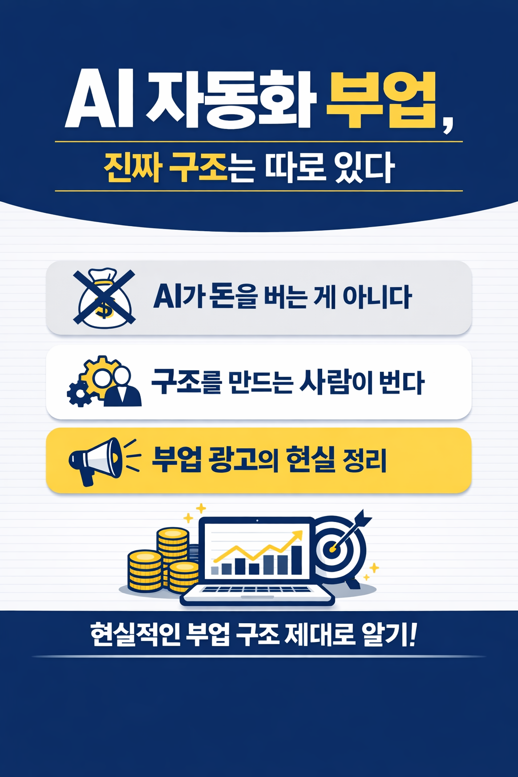 AI 자동화 부업은 ‘자동 수익’이 아니라 ‘덜 일하고 오래가는 구조’를 만드는 일이다.